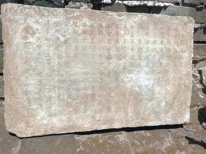 “發(fā)現(xiàn)一塊石碑,出土?xí)r碑文一面向下,推測(cè)這塊石碑原來鑲嵌在北側(cè)垛口墻內(nèi)側(cè),墻體傾斜倒塌后,石碑脫落。”項(xiàng)目考古負(fù)責(zé)人、北京考古研究院副研究員尚珩介紹。石碑為青石材質(zhì),保存完整,邊框刻著纏枝卷草紋。因?yàn)槊撀鋾r(shí)碑文面朝下,因此碑文保存完好,字體為繁體字,字跡娟秀,清晰可辨。