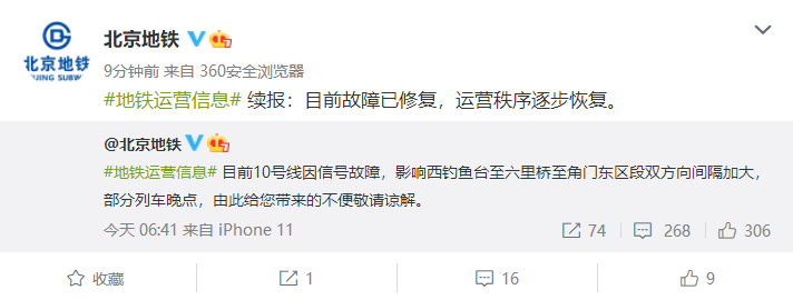 北京地鐵:10號(hào)線故障已修復(fù),運(yùn)營(yíng)秩序逐步恢復(fù)