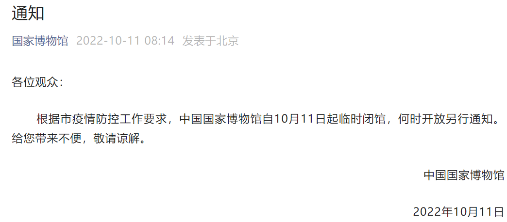 央廣網北京10月11日消息 據(jù)國家博物館官方微信公眾號消息,根據(jù)北京市疫情防控工作要求,中國國家博物館自10月11日起臨時閉館,何時開放另行通知。