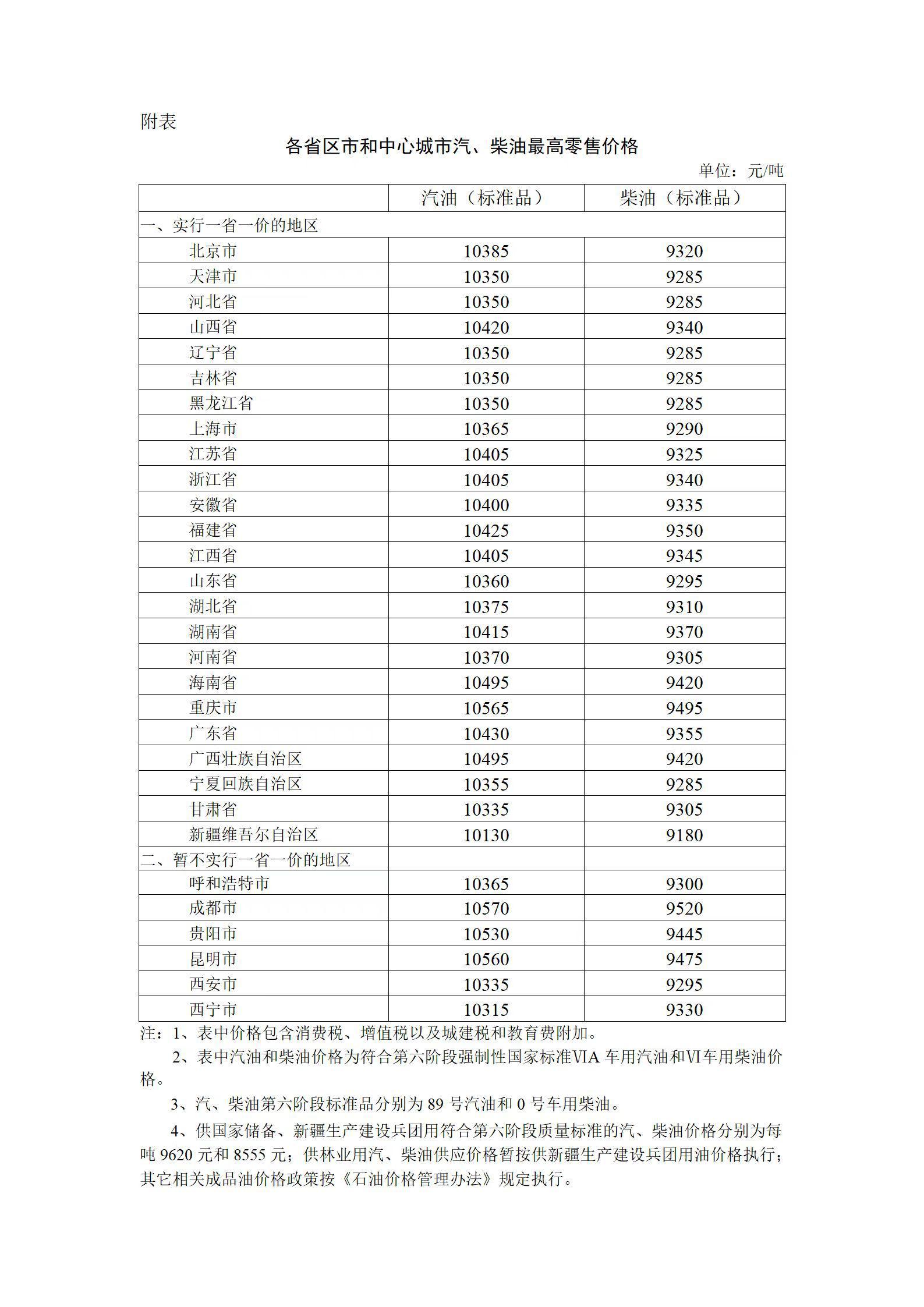 各省區(qū)市和中心城市汽、柴油最高零售價格(圖片來源:國家發(fā)展改革委官網(wǎng))