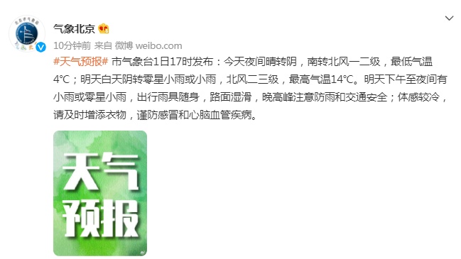 北京市氣象臺1日17時(shí)發(fā)布:今天(1日)夜間晴轉(zhuǎn)陰,南轉(zhuǎn)北風(fēng)一二級,最低氣溫4℃;明天白天陰轉(zhuǎn)零星小雨或小雨,北風(fēng)二三級,最高氣溫14℃。