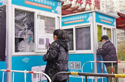 11月23日,朝陽區(qū)鴻博家園第四社區(qū),居民掃碼登記進(jìn)行核酸檢測(cè)。 新京報(bào)記者 王飛 攝