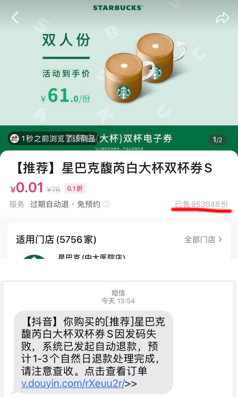 央廣網(wǎng)記者注意到,23日有多名網(wǎng)友在社交平臺(tái)微博反饋,星巴克近日在某平臺(tái)推出0.01元購(gòu)2杯馥芮白咖啡券團(tuán)購(gòu)活動(dòng),賣出95萬(wàn)多單。但是不少消費(fèi)者表示搶券后,發(fā)現(xiàn)無(wú)法兌換,被星巴克自動(dòng)退款了。