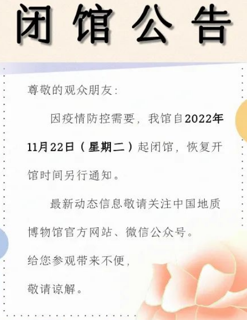 中國地質(zhì)博物館發(fā)布公告稱,因疫情防控需要,中國地質(zhì)博物館自11月22日起閉館,恢復(fù)開館時間另行通知。