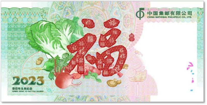 紀(jì)念券背面主景采用多個“?!弊值慕M合,寓意著新的一年福氣連連、福滿門。背景團花中有玉兔搗藥的圖案,表達了疫情之下祈求健康、幸福的真摯愿望。白菜、蘿卜、蘑菇也都有著各自的深意,比如白菜諧音“百財”,且有清白之意;蘿卜在閩南方言叫“菜頭”,諧音彩頭;蘑菇則象征蓬勃向上的生命力量。這些看似普通的元素給人以親切之感,更寓意著源源不斷的財運、好運和幸運。