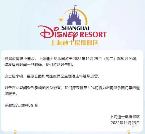 央廣網(wǎng)上海11月29日消息(記者林馥榆)記者從上海迪士尼度假區(qū)獲悉,根據(jù)疫情防控要求,上海迪士尼樂園于11月29日起暫時(shí)關(guān)閉,恢復(fù)運(yùn)營(yíng)時(shí)間待定。