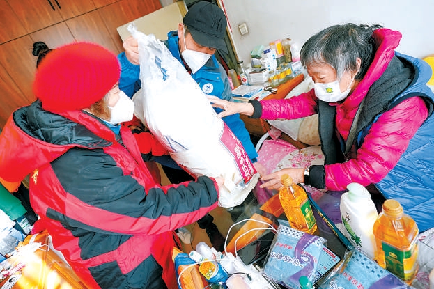 昨天,在龍?zhí)督值佬腋I鐓^(qū)養(yǎng)老服務驛站,“夕陽手拉手互助團”和“小棉襖愛老”的志愿者們,將愛心物資送到社區(qū)養(yǎng)老家庭照護床位的老人手中。疫情下,老年群體更加需要關注與關愛,志愿者們以需求為導向,精準服務老年人。 本報記者 方非攝