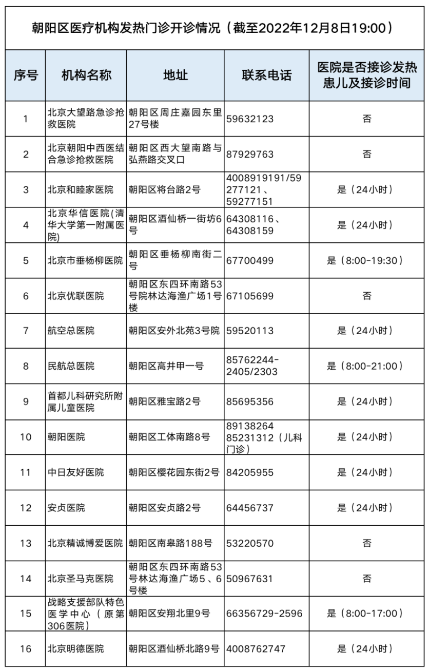 朝陽區(qū)16家發(fā)熱門診醫(yī)療機構信息