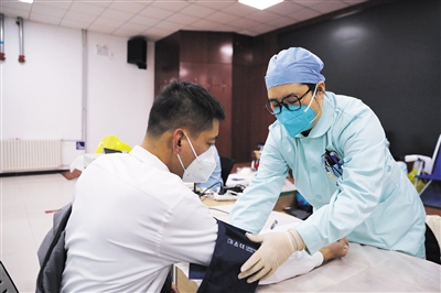 12月22日,朝陽區(qū)左家莊街道辦事處,醫(yī)護(hù)工作者為獻(xiàn)血者測量血壓。新京報記者 王飛 攝