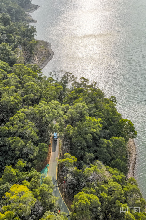 冬日暖陽(yáng)下,綠意盎然、湖水環(huán)抱的石竹山(央廣網(wǎng)發(fā) 謝貴明 攝)