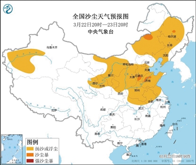 中央氣象臺昨日18時(shí)繼續(xù)發(fā)布沙塵暴黃色預(yù)警,受冷空氣大風(fēng)影響,預(yù)計(jì)22日20時(shí)至23日20時(shí),新疆西南部、內(nèi)蒙古中西部和東南部、青海東北部、甘肅中部、寧夏、陜西中北部、山西、河北中南部、北京南部、天津中南部、山東、河南、安徽中北部、江蘇中北部、湖北北部、黑龍江中西部、吉林中西部、遼寧等地的部分地區(qū)有揚(yáng)沙或浮塵天氣,其中,內(nèi)蒙古中部偏北地區(qū)、黑龍江南部、河北西南部、山東西部局地有沙塵暴。