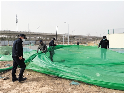 3月22日,石景山古城街道綜合行政執(zhí)法人員來到轄區(qū)內(nèi)工地,要求施工單位對裸露地面、渣土堆放場所及時(shí)苫蓋,施工期間進(jìn)行灑水降塵,渣土運(yùn)輸車輛確保清潔到位上路不遺撒,從源頭杜絕揚(yáng)塵污染源的發(fā)生。新京報(bào)記者 浦峰 通訊員 王亞楠 攝
