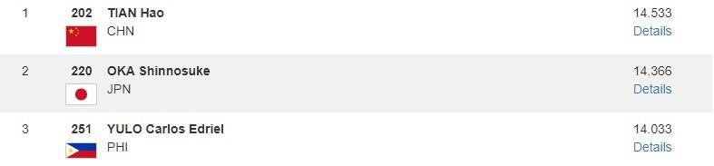 男子單杠項(xiàng)目,田昊以14.533分奪得冠軍。另一名中國(guó)選手蘇煒德以11.866分排名第七。