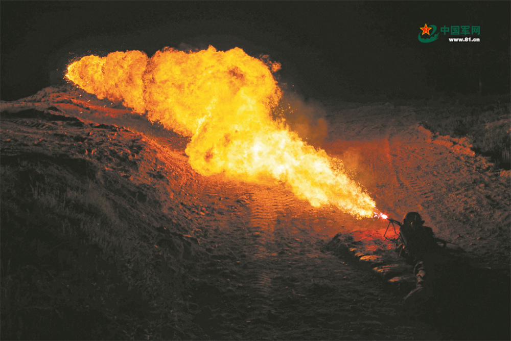 陸軍某旅組織防化分隊開展夜間噴火器實噴訓練。萬智奇 攝