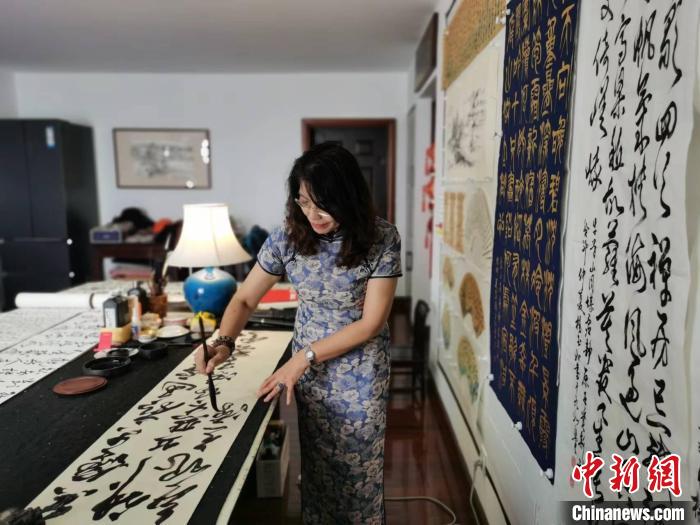 近日,楊玉如在書(shū)齋中練習(xí)書(shū)法?!≈行律缬浾?鐘升 攝