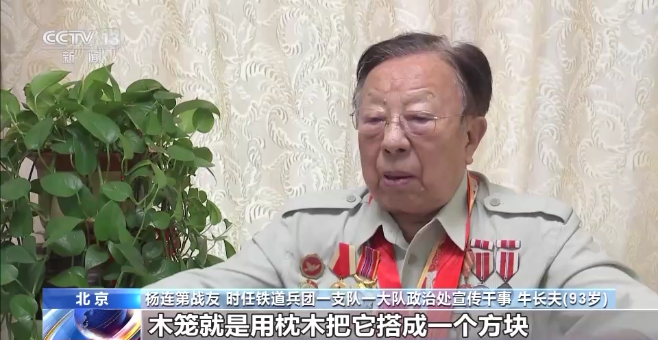 楊連第戰(zhàn)友 時任鐵道兵一支隊一大隊政治處宣傳文化干事 牛長夫:當(dāng)時給把橋梁炸毀了,我們上哪弄梁去,楊連第(想了)一個很絕妙的辦法,就是木籠加木排。木籠就是用的枕木把它搭成一個方塊,里面投上石頭,作為橋梁的基礎(chǔ),上面再架排架,扣上鋼軌,這樣就可以維持通車了。楊連第一個多星期,就在水里面泡著。