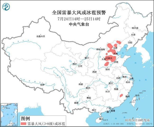 預(yù)計(jì)7月24日14時(shí)至25日14時(shí),山西東部、河北大部、北京西部和東南部、天津中西部和南部、山東北部、河南西北部、福建西北部等地的部分地區(qū)將有8級(jí)-10級(jí)雷暴大風(fēng)或冰雹天氣;黑龍江西北部、吉林中東部、遼寧北部和西南部、青海東部、甘肅西南部、陜西中東部、山西東部、河北大部、北京大部、天津、山東中北部、河南西部、江蘇中部、上海東南部、湖北西南部、湖南北部、江西中南部、浙江、福建、四川中南部、重慶、貴州北部、云南中南部、廣東東北部、海南島西南部、臺(tái)灣島東部等地的部分地區(qū)將有短時(shí)強(qiáng)降水天氣,小時(shí)雨量30-50毫米,局地可達(dá)70毫米以上。