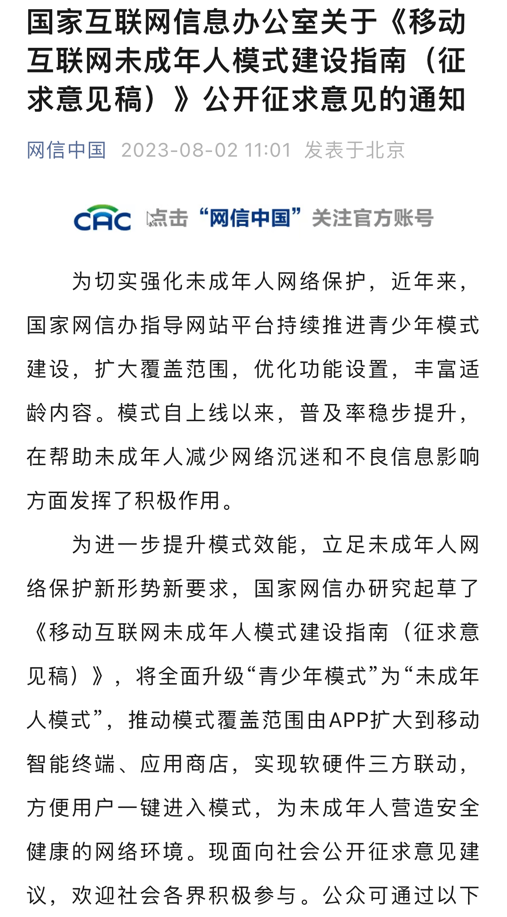 央廣網(wǎng)北京8月3日消息(總臺中國之聲記者馮爍)據(jù)中央廣播電視總臺中國之聲報道,為進(jìn)一步幫助未成年人減少網(wǎng)絡(luò)沉迷和不良信息影響,國家網(wǎng)信辦8月2日發(fā)布了關(guān)于《移動互聯(lián)網(wǎng)未成年人模式建設(shè)指南(征求意見稿)》(以下簡稱《指南》)公開征求意見,將未成年人網(wǎng)絡(luò)保護(hù)的覆蓋范圍由App擴(kuò)大到移動智能終端、應(yīng)用程序、分發(fā)平臺,把“青少年模式”升級為“未成年人模式”。相關(guān)部門如何給未成年人網(wǎng)絡(luò)保護(hù)設(shè)置護(hù)欄?