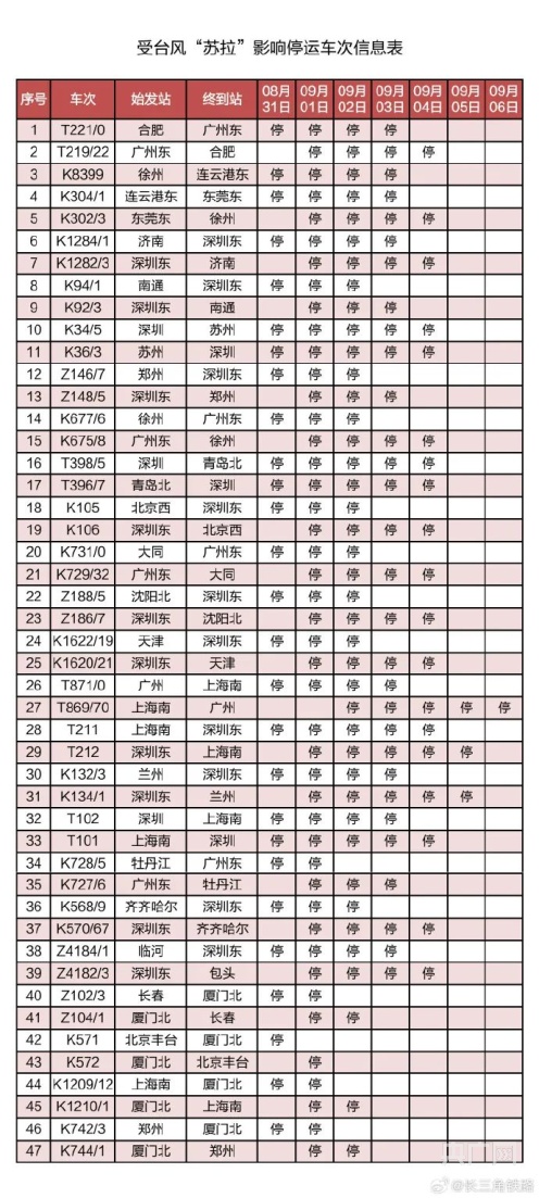 記者從中國鐵路上海局集團(tuán)有限公司獲悉,受第9號臺風(fēng)“蘇拉”影響,為確保列車運(yùn)行安全,鐵路部門計(jì)劃對杭深線、京港高鐵、廣深城際、廣深港高鐵、穗深城際、京九線等線路運(yùn)行的部分列車采取停運(yùn)措施。截至30日17時(shí)30分,計(jì)劃停運(yùn)8月31日至9月6日間共121趟旅客列車:其中停運(yùn)動(dòng)車組列車74趟,停運(yùn)普速列車47趟。