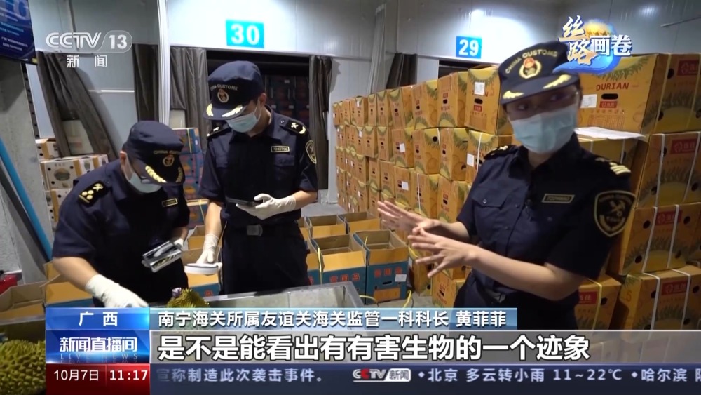 南寧海關(guān)所屬友誼關(guān)海關(guān)監(jiān)管一科科長(zhǎng) 黃菲菲:現(xiàn)在他們主要查驗(yàn)的就是榴蓮的外表面,是不是能看出有有害生物的一個(gè)跡象。當(dāng)然他們同時(shí)還會(huì)對(duì)貨證相符性和證證相符性進(jìn)行一個(gè)全面的檢查。比如說(shuō)您看這個(gè)就是越南方面開(kāi)出來(lái)的植物檢疫證書(shū),就是為了保證榴蓮又快又好地進(jìn)入國(guó)內(nèi)市場(chǎng),然后讓我們的消費(fèi)者能夠安心地食用。