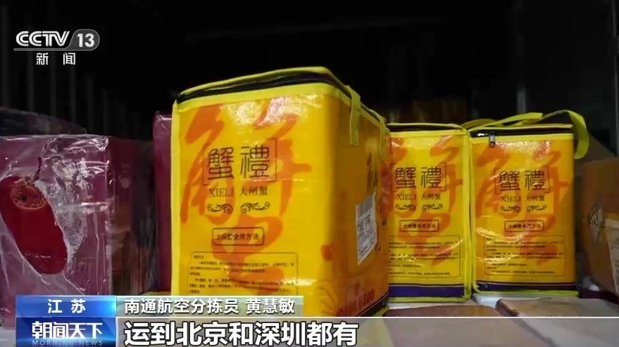 南通航空分揀員 黃慧敏:這批是來(lái)的鎮(zhèn)江郭莊來(lái)的大閘蟹,已經(jīng)開(kāi)始分揀了,運(yùn)到北京和深圳都有。