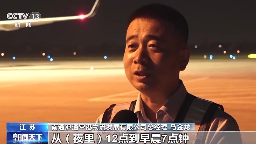 南通滬通空港物流發(fā)展有限公司總經(jīng)理 馬金龍:從夜里12點(diǎn)到早晨7點(diǎn)鐘,陸續(xù)有8個(gè)航班離港,目的站主要是廣州、深圳、北京幾個(gè)機(jī)場(chǎng)。