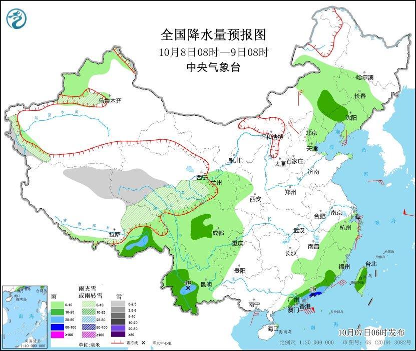 10月7日08時(shí)至8日08時(shí),內(nèi)蒙古中部、西藏東南部、江南東部和南部、西南地區(qū)南部、華南北部和南部、臺(tái)灣島大部等地部分地區(qū)有中到大雨,其中,福建東南部、廣東東南部等地部分地區(qū)有暴雨(50~60毫米)。內(nèi)蒙古中部、遼東半島、浙江北部、廣東中部等地部分地區(qū)有4~6級(jí)風(fēng)(見(jiàn)圖1)。