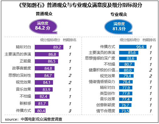 張藝謀導演新作《堅如磐石》獲得觀眾滿意度評分84.1分,居2023年國慶檔調查五部影片首位,作為聚焦反腐反黑的警匪題材影片,對于社會現(xiàn)實以及人性的描摹深度和豐富層次得到了觀眾的高度好評,思想性得分85.4分,為三大指數(shù)中最高,觀賞性得分84.4分,為檔期最高分,其中主要演員的表演得到了不同觀眾的高度評價,在2023年調查的50部影片中分別居普通觀眾評價的第6位和專業(yè)觀眾評價的第3位。