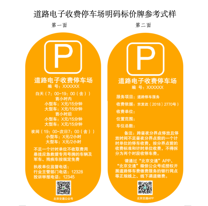根據(jù)相關(guān)法規(guī)政策的新要求,按照依法合規(guī)、便民利民、不做大改的原則,征求意見稿對(duì)兩種機(jī)動(dòng)車停車場(chǎng)明碼標(biāo)價(jià)牌參考式樣進(jìn)行了修改完善,并附上“經(jīng)營(yíng)性機(jī)動(dòng)車停車場(chǎng)明碼標(biāo)價(jià)牌參考式樣”和“道路電子收費(fèi)停車場(chǎng)明碼標(biāo)價(jià)牌參考式樣”,供相關(guān)單位參照自行制作明碼標(biāo)價(jià)牌,明碼標(biāo)價(jià)牌編號(hào)為北京市公共停車場(chǎng)經(jīng)營(yíng)備案證的備案號(hào)。