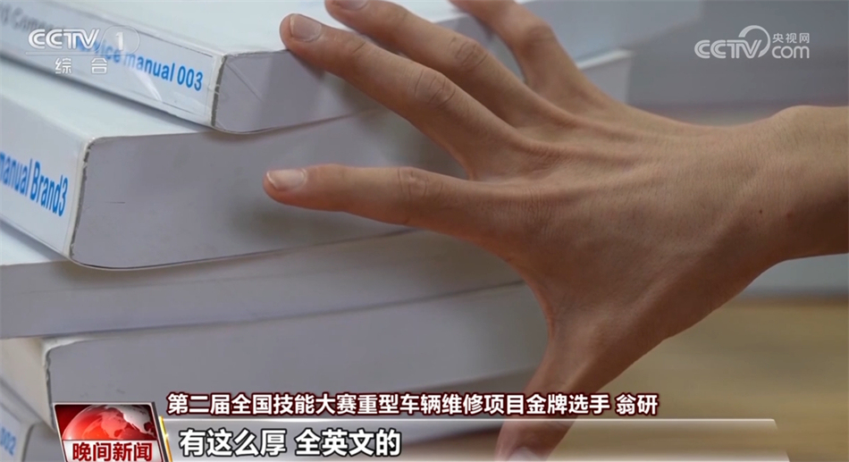 第二屆全國技能大賽重型車輛維修項目金牌選手 翁研:其實這次比賽的車型在一個月前才公布,而且全都是全新的車型,像我們比賽的資料(一個模塊)有2700多頁,這么厚,全英文的。