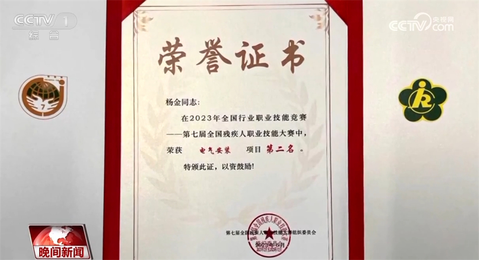 今年,在取得第七屆全國殘疾人職業(yè)技能大賽參賽資格后,楊金每天都堅持12小時的高強度訓(xùn)練,最終在電氣安裝項目上拿到了銀牌。