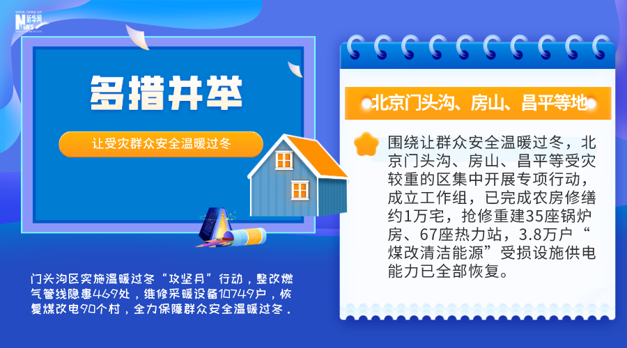 圍繞讓群眾安全溫暖過冬,北京門頭溝、房山、昌平等受災(zāi)較重的區(qū)集中開展專項(xiàng)行動(dòng),成立工作組,已完成農(nóng)房修繕約1萬宅,搶修重建35座鍋爐房、67座熱力站,3.8萬戶“煤改清潔能源”受損設(shè)施供電能力已全部恢復(fù)。
