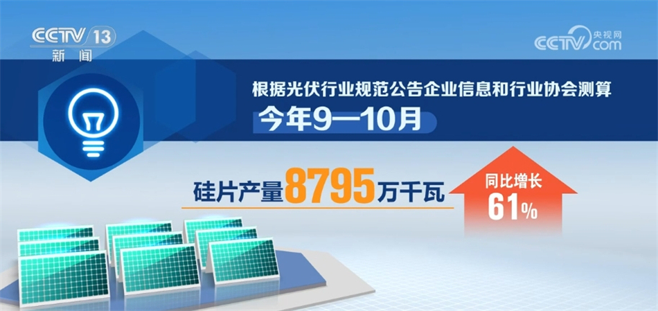 央視網(wǎng)消息:工業(yè)和信息化部12月13日發(fā)布當(dāng)前全國(guó)光伏制造行業(yè)最新運(yùn)行情況。數(shù)據(jù)顯示,今年9—10月,我國(guó)光伏制造業(yè)保持高位運(yùn)行,硅料、硅片、電池、組件產(chǎn)量同比增長(zhǎng)均超60%。