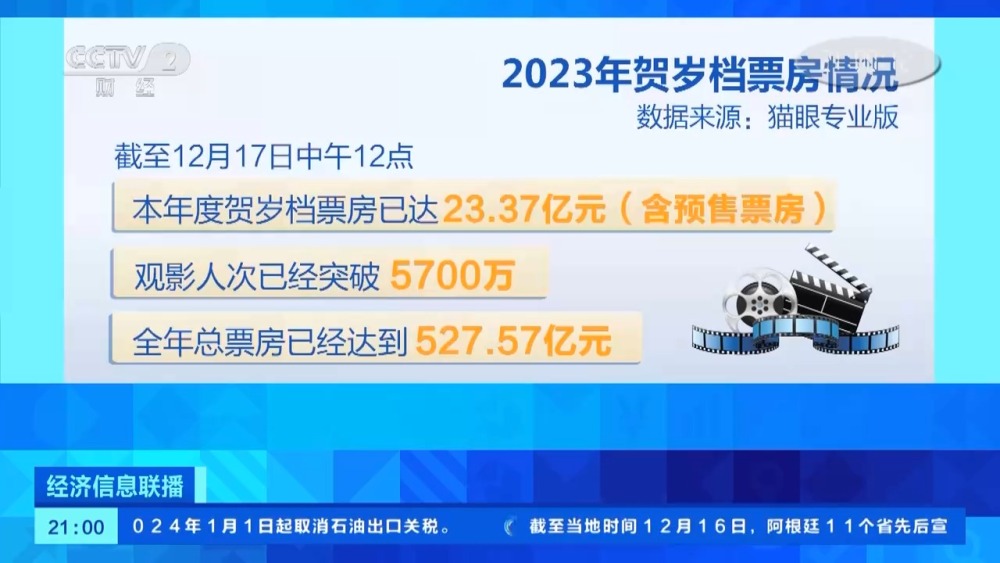 某電影數(shù)據(jù)平臺顯示,截至12月17日中午12點,本年度賀歲檔票房已達23.37億元(含預(yù)售票房),觀影人次已經(jīng)突破5700萬,全年總票房已經(jīng)達到527.57億元。