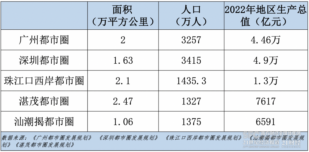 “都市圈是開放的‘圈’,是市場聯(lián)系和社會分工更密集的概念?!标慀櫽钕蛴浾弑硎荆际腥Φ奶岢鍪菫榱藚f(xié)調城鄉(xiāng)發(fā)展,通過動態(tài)調整規(guī)劃不斷增強都市圈新內涵,將釋放廣東省區(qū)域經濟發(fā)展的新質生產力。據公開數據顯示,2022年,廣州都市圈地區(qū)生產總值4.46萬億元,深圳都市圈4.9萬億元,珠江口西岸都市圈1.3萬億元,汕潮揭都市圈7617億元,湛茂都市圈6591億元,合計12.08萬億元。