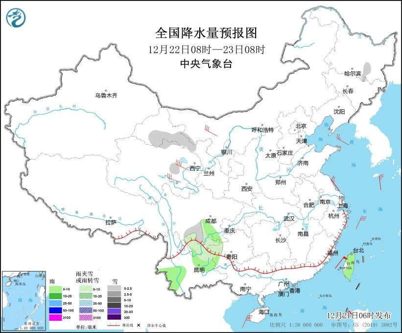12月22日08時(shí)至23日08時(shí),山東半島、青海北部和東部、甘肅河西、四川南部、貴州西北部、云南東北部等地部分地區(qū)有小雪或雨夾雪,其中,山東半島北部等地部分地區(qū)有中雪。四川盆地南部、云南西南部和中部、臺(tái)灣島大部等地部分地區(qū)有小雨。內(nèi)蒙古西部、青海東部和南部等地部分地區(qū)有5~7級(jí)風(fēng)(見(jiàn)圖4)。
