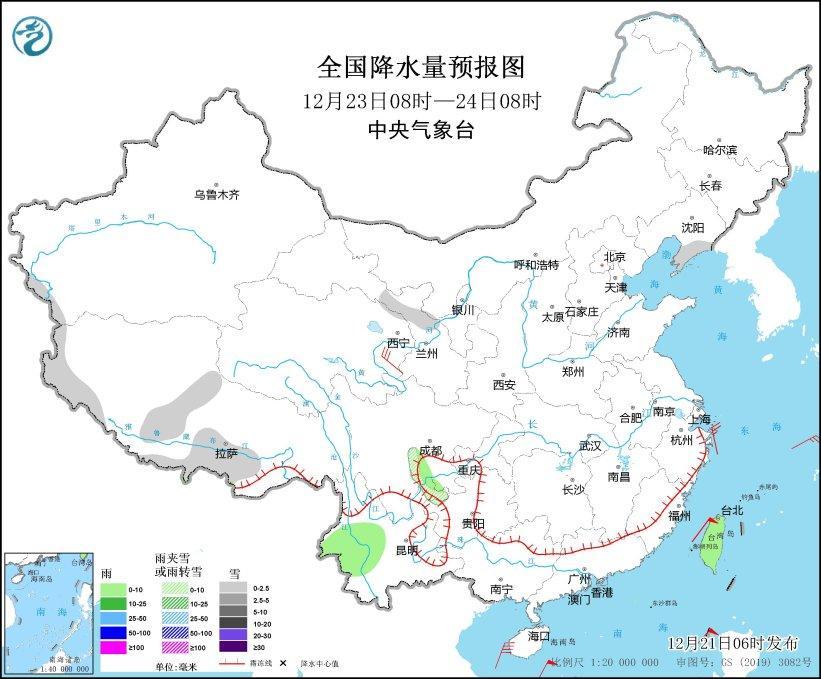 12月23日08時(shí)至24日08時(shí),遼東半島、西藏南部和西部、甘肅河西等地部分地區(qū)有小雪或雨夾雪。四川盆地西南部、云南西部、臺(tái)灣島等地部分地區(qū)有小雨。青海東部、浙江東部等地部分地區(qū)有4~6級(jí)風(fēng)(見(jiàn)圖5)。