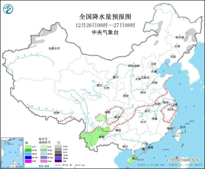 12月26日08時至27日08時,內(nèi)蒙古東北部、黑龍江東部、吉林東部、新疆北部、四川南部等地部分地區(qū)有小到中雪或雨夾雪。四川南部、云南中西部、海南島大部等地部分地區(qū)有小雨。黑龍江東南部部分地區(qū)有4~5級風(見圖1)。
