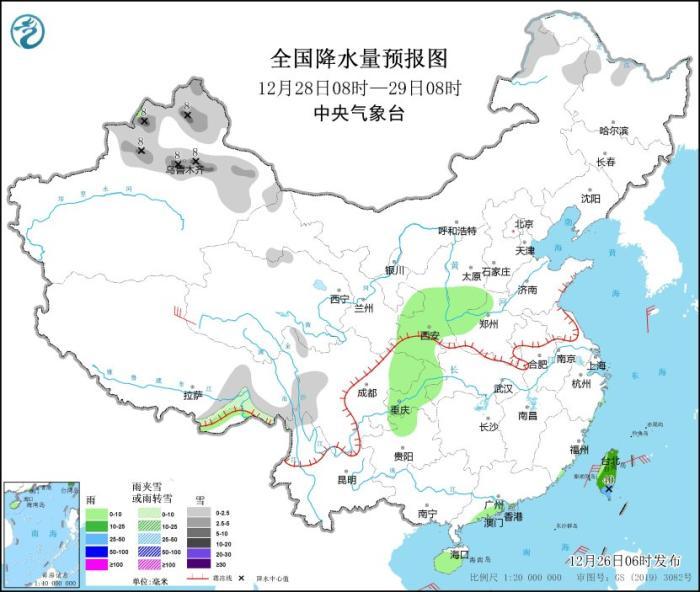 12月28日08時至29日08時,內(nèi)蒙古東北部、黑龍江西北部、新疆北部、西藏東部等地部分地區(qū)有小雪或雨夾雪,其中,新疆北疆北部和沿天山地區(qū)等地部分地區(qū)有中到大雪(5~8毫米)。西北地區(qū)東部、華北南部、黃淮西部、西南地區(qū)東部、臺灣島等地部分地區(qū)有小到中雨,其中,臺灣島等地部分地區(qū)有大雨(25~40毫米)。青海西部部分地區(qū)有5~6級風(見圖3)。