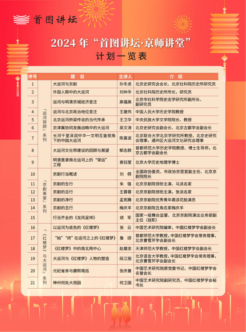 北京史研究會會長孫冬虎發(fā)布“京師講堂”2024年度主題講座計劃。全年近50場講座,包括北京胡同四合院、三山五園、明清北京商業(yè)、龍年說龍等歷史文化與社會生活主題,還有四項專題系列講座——“運河探頤”系列將以大運河的歷史變遷與運河文化的挖掘、研究、傳承為焦點,展示北京城市發(fā)展與大運河的密切關系;“京劇美鑒”系列致力于讓聽眾體味京劇國粹的獨特風韻與文化價值;“《紅樓夢》與大運河”系列將挖掘《紅樓夢》與世界文化遺產(chǎn)大運河之間的密切關聯(lián);“清朝宮廷”系列將還原清代宮廷生活的真實場景,提升聽眾關于清代歷史與文化的準確認知。