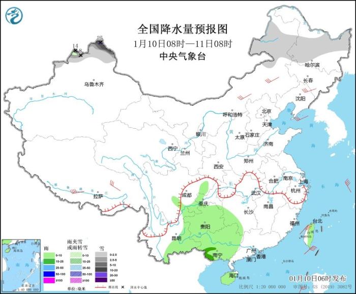 1月10日08時至11日08時,內蒙古東部、黑龍江中北部、新疆北疆北部等地部分地區(qū)有小到中雪或雨夾雪,其中,新疆北疆塔城、阿勒泰地區(qū)等地有大到暴雪,局地大暴雪(20~25毫米)。四川盆地東南部、重慶西部、貴州、云南東部、廣西、湖南西南部、海南島、臺灣島東部等地部分地區(qū)有小到中雨。內蒙古中部、遼寧北部等地部分地區(qū)有5~6級風;渤海、渤海海峽、黃海北部和南部、東海、臺灣海峽、臺灣以東洋面、巴士海峽、南海大部等海域有6~7級風、陣風8~9級。