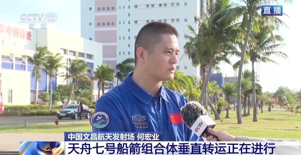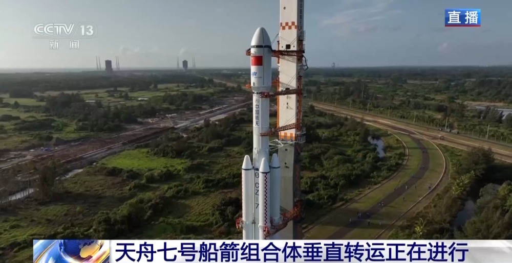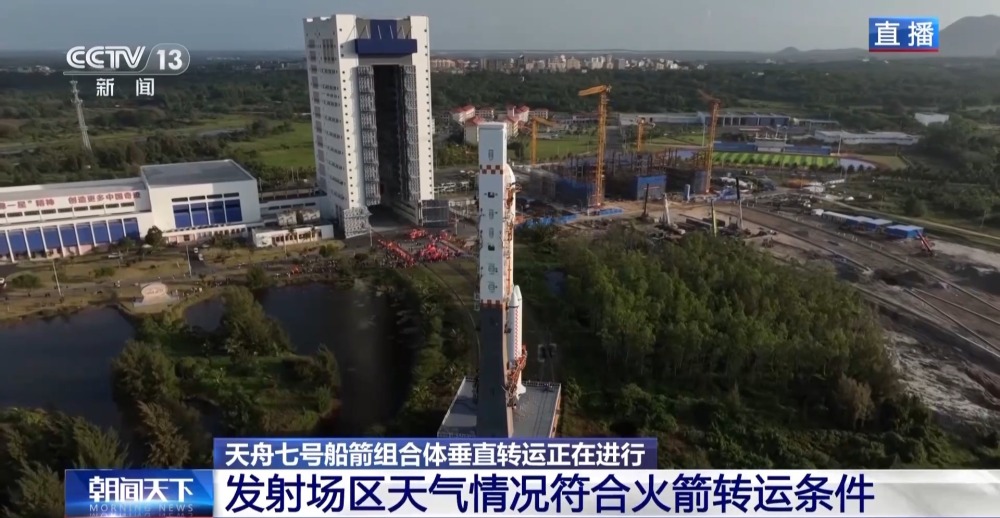 天舟七號(hào)船箭組合體垂直轉(zhuǎn)運(yùn)正在文昌航天發(fā)射場進(jìn)行