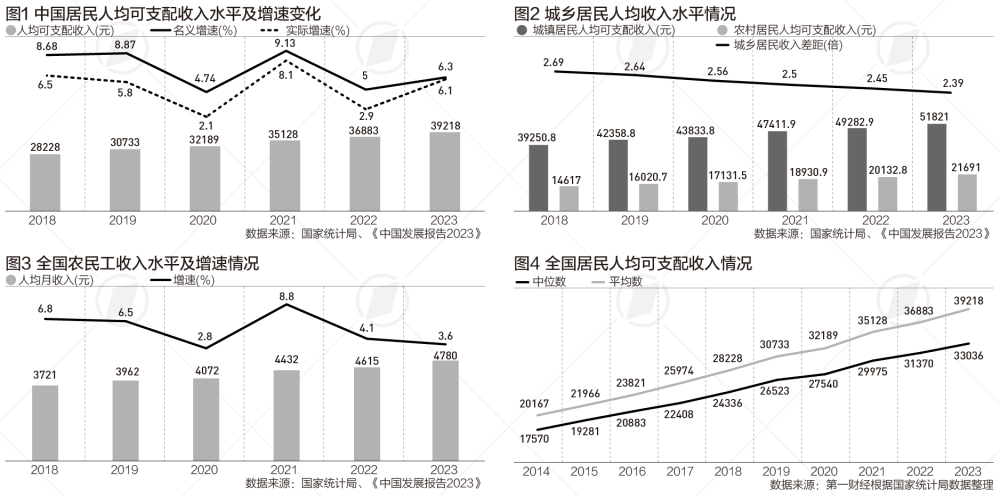 經(jīng)歷三年疫情期間“過(guò)山車”式起伏之后,我國(guó)居民可支配收入實(shí)際增速在2023年回歸了6%左右的正常區(qū)間。在過(guò)去十年間,無(wú)論是中位數(shù)還是平均數(shù),全國(guó)居民人均可支配收入都實(shí)現(xiàn)了翻一番。