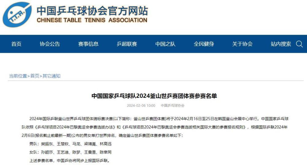 北京時間2月6日,中國乒協(xié)官網(wǎng)發(fā)布了中國國家乒乓球隊釜山世乒賽團(tuán)體賽參賽名單。中國國家乒乓球隊依照《乒乓球項目2024年巴黎奧運(yùn)會參賽選拔辦法》和《乒乓球項目2024年巴黎奧運(yùn)會參賽選拔相關(guān)國際大賽的參賽報名規(guī)則》,根據(jù)國際乒聯(lián)2024年2月6日(報名截止前最新一期)公布的男女單打世界排名,確定釜山世乒賽團(tuán)體賽參賽名單如下: