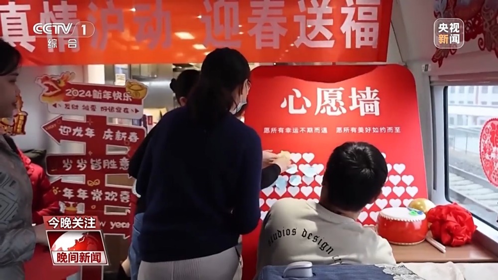 同樣,在青島開往上海虹橋的G232次列車上,列車工作人員寫福字寫春聯(lián),提前為旅客送上新春祝福。工作人員還為每一名參加活動的旅客,準(zhǔn)備了愛心形狀的便利貼,寫下新年心愿。