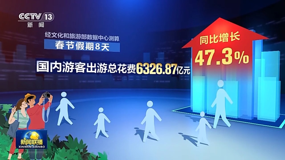 今年這個(gè)春節(jié),人們走得更遠(yuǎn),游玩時(shí)間更長。出行平臺分析訂單數(shù)據(jù)后發(fā)現(xiàn),假期里,超過一半的人選擇跨省出游,其中三成以上的人選擇兩個(gè)及以上目的地,中國游客出境目的地覆蓋全球1700多個(gè)城市,個(gè)性化出游、定制化消費(fèi)成為新趨勢。在陜西景區(qū)里看一場沉浸式演出,游客既是觀眾,又是演員,全新消費(fèi)體驗(yàn)帶來上億元演出收入;四川把火鍋文化和特色觀光結(jié)合在一起,帶動特色餐飲消費(fèi)熱度不斷。節(jié)日里,滕王閣景區(qū)北園向公眾開放,通過濱江水道,游客可以直接穿行老城區(qū)的商鋪。經(jīng)文化和旅游部數(shù)據(jù)中心測算,春節(jié)假期八天,全國國內(nèi)旅游出游4.74億人次,同比增長34.3%,國內(nèi)游客出游總花費(fèi)6326.87億元,同比增長47.3%。