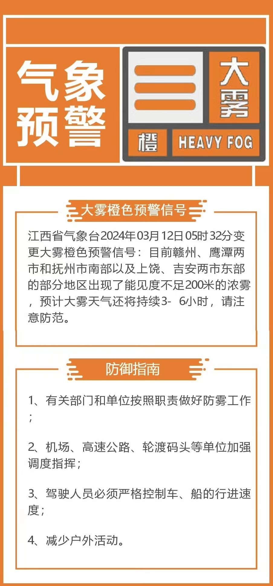 江西省氣象臺2024年3月12日5時32分變更大霧橙色預警信號:目前贛州、鷹潭兩市和撫州市南部以及上饒、吉安兩市東部的部分地區(qū)出現(xiàn)了能見度不足200米的濃霧,預計大霧天氣還將持續(xù)3~6小時,請注意防范。