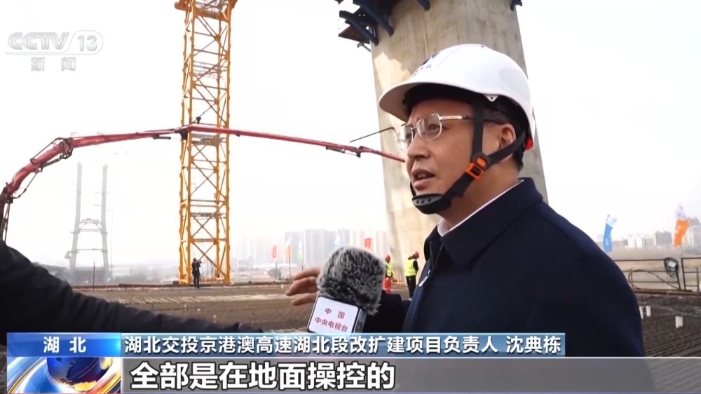 湖北交投京港澳高速湖北段改擴建項目負責人 沈典棟:這個塔頂上就是輕型智能筑塔機,是采用智能建造的技術,全都是在地面操控的,塔上無人,這樣就保證了我們工人安全。我們這個智能的布料系統(tǒng),布料很均勻,讓混凝土不產生離析。