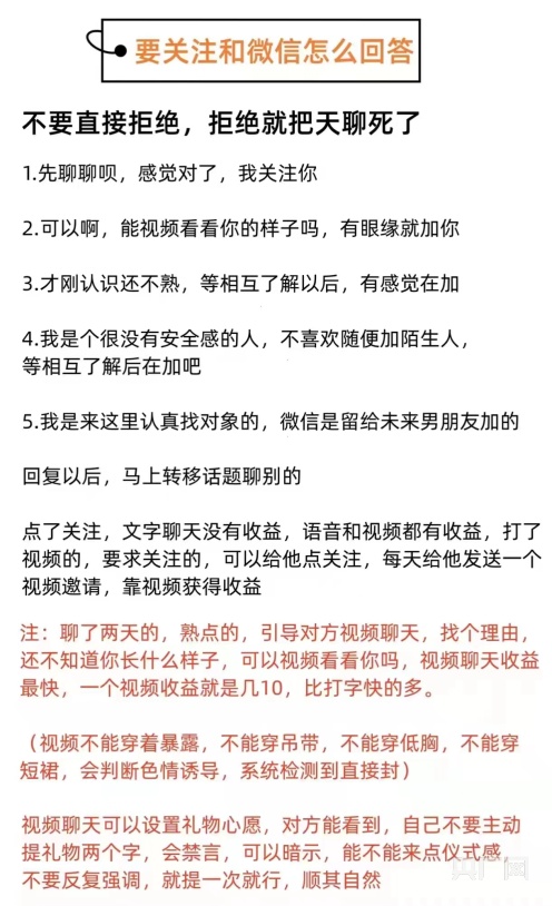 記者注意到,“使用手冊(cè)”第一頁(yè)聲明中稱(chēng),只參與軟件推廣,不涉及套路教學(xué)、虛假聊天、誘導(dǎo)充值。當(dāng)記者對(duì)是否能賺到錢(qián)表示擔(dān)憂(yōu)時(shí),該推廣員發(fā)來(lái)一份“社交聊天日入千元攻略”,包含怎樣設(shè)置頭像、如何引導(dǎo)對(duì)方視頻聊天、如何拒加微信等信息。