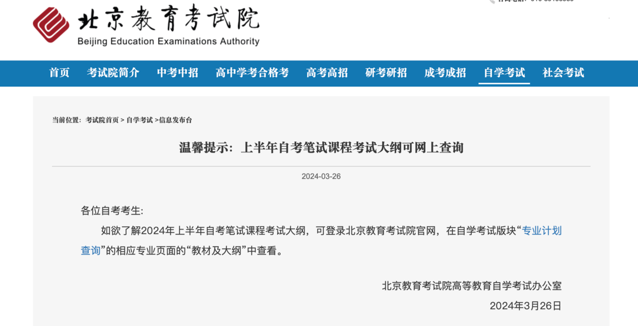 央廣網(wǎng)北京3月27日消息(記者 吳佳怡)據(jù)悉,2024年上半年自考筆試課程考試大綱可網(wǎng)上查詢。考生可登錄北京教育考試院官網(wǎng),在自學(xué)考試版塊“專業(yè)計(jì)劃查詢”的相應(yīng)專業(yè)頁(yè)面的“教材及大綱”中查看。